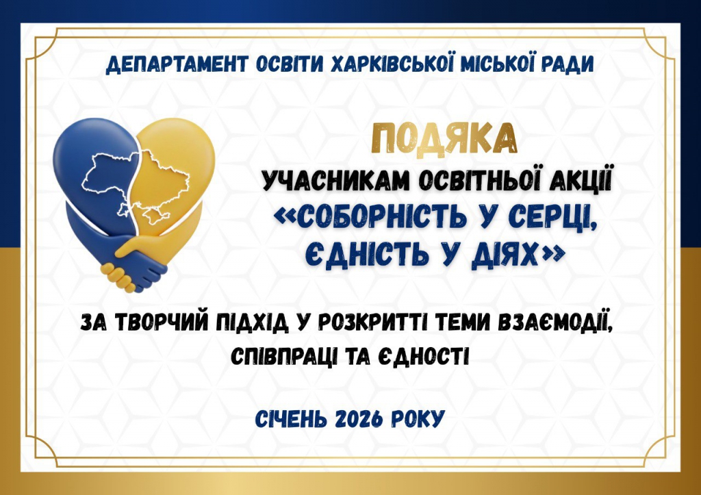 Упродовж січня освітня акція «Соборність у серці, єдність у діях» об’єднала учасників освітнього процесу Харкова навколо того, що для кожного означає єдність. Департамент освіти Харківської міської ради щиро дякує всім, хто долучився та поділився своїм досвідом.