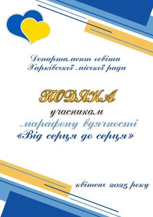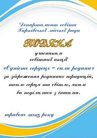 Департамент освіти Харківської міської ради щиро вдячний кожному, хто з відкритим серцем долучається до міських ініціатив, освітніх подій і волонтерських акцій. Разом із вами ми створюємо те, що об'єднує, надихає й дарує надію. Усе, що вдається здійснити, стає можливим завдяки вашій участі, ідеям та небайдужості.