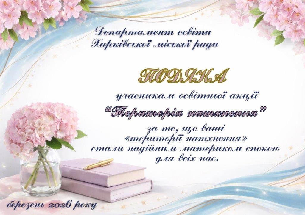 Сьогодні питання ментального здоров’я учасників освітнього процесу набуває особливої актуальності: постійна напруга, тривожність і невизначеність потребують делікатної, безпечної та доступної підтримки. Саме тому важливо створювати простір, де діти, підлітки та дорослі можуть говорити про свої емоції, знаходити внутрішні ресурси й відчувати опору. Департамент освіти Харківської міської ради у березні запрошує родини учнів 1–11-х класів, педагогів та представників позашкілля долучитися до освітньої акції «Територія натхнення», яка триватиме з 02 по 20 березня 2026 року.