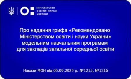 Про надання грифу «Рекомендовано Міністерством освіти і науки України» навчальним програмам для 5 - 12 класівОпублікував admin. Дата публікації 15/09/2025Теги: Наша бібліотека