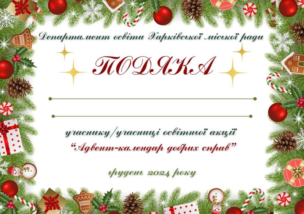 Департамент освіти Харківської міської ради щиро дякує учасникам освітньої акції «Адвент-календар добрих справ». Зима завжди приносить нам очікування дива, але в грудні диво творили саме ви. Своїми теплими руками, відкритими серцями та невтомною працею ви наповнили світ світлом і добром. Ваші дії стали відлунням щирої людяності, якої так бракує сьогодні, і кожна добра справа, зроблена вами, перетворювала звичайні дні на свята надії та турботи. Завдяки вашій участі в акції "Адвент-календар добрих справ" було отримано 3 948 робіт — 3 948 історій про щирість, взаємопідтримку й віру в краще. Більше 400 робіт опубліковані у Telegram-каналах «Харків надихає» та «Герої освітнього фронту», та майже 200 – у інших спільнотах Департаменту освіти.