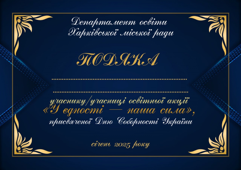 Департамент освіти Харківської міської ради щиро дякує учасникам освітньої акції «У єдності — наша сила» за активність, натхнення та небайдужість. Ваша участь у цій ініціативі до Дня Соборності України є яскравим свідченням того, що разом ми здатні долати труднощі, творити майбутнє та зміцнювати нашу єдність.