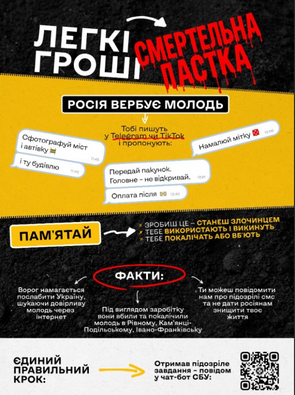 Міністерство освіті і науки України інформує, що у межах проведення попереджувально-профілактичних заходів, завданням яких є недопущення втягування української молоді та неповнолітніх осіб у диверсійно-підривну діяльність на шкоду державній безпеці України, фахівцями Центру стратегічних комунікацій та інформаційної безпеки України у взаємодії зі Службою безпеки України розроблено методичний посібник (лист МОН від 10.06.2025 р. №1/12085-25). Збірка розкриває форми та методи, які використовуються російськими спецслужбами для вербування / залучення неповнолітніх осіб, висвітлює ознаки перебування дітей у зоні ризику.