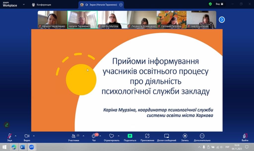У жовтні 2025 року продовжила роботу Школа молодого фахівця психологічної служби закладів освіти міста Харкова. Для 27 практичних психологів і соціальних педагогів закладів загальної середньої та дошкільної освіти, які працюють перший рік, проведено три онлайн-засідання.