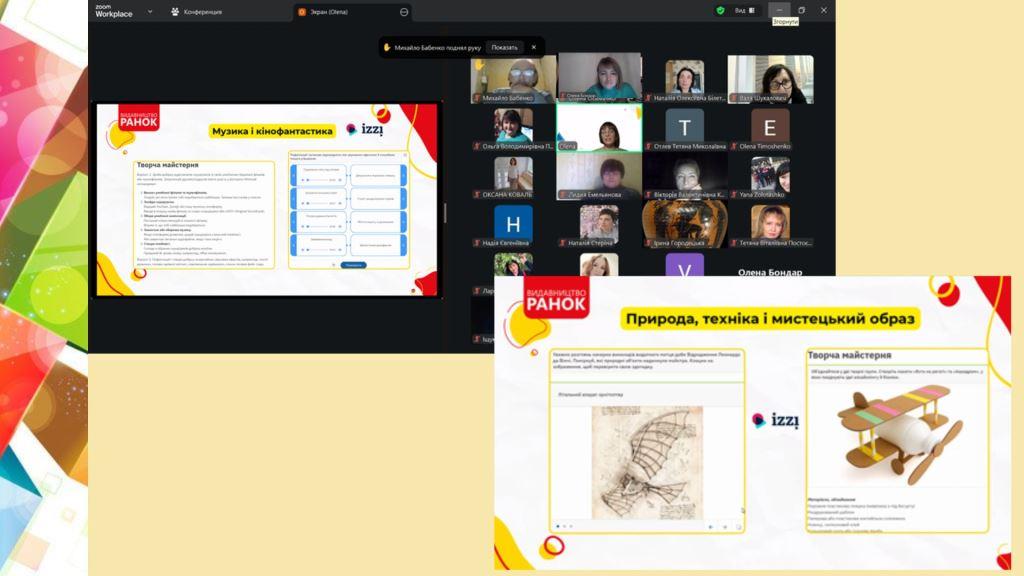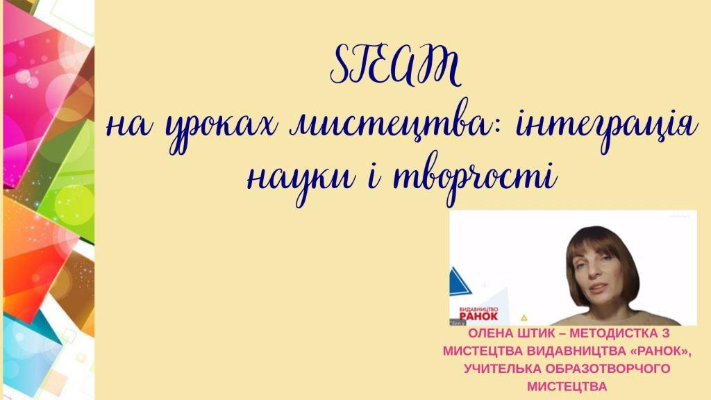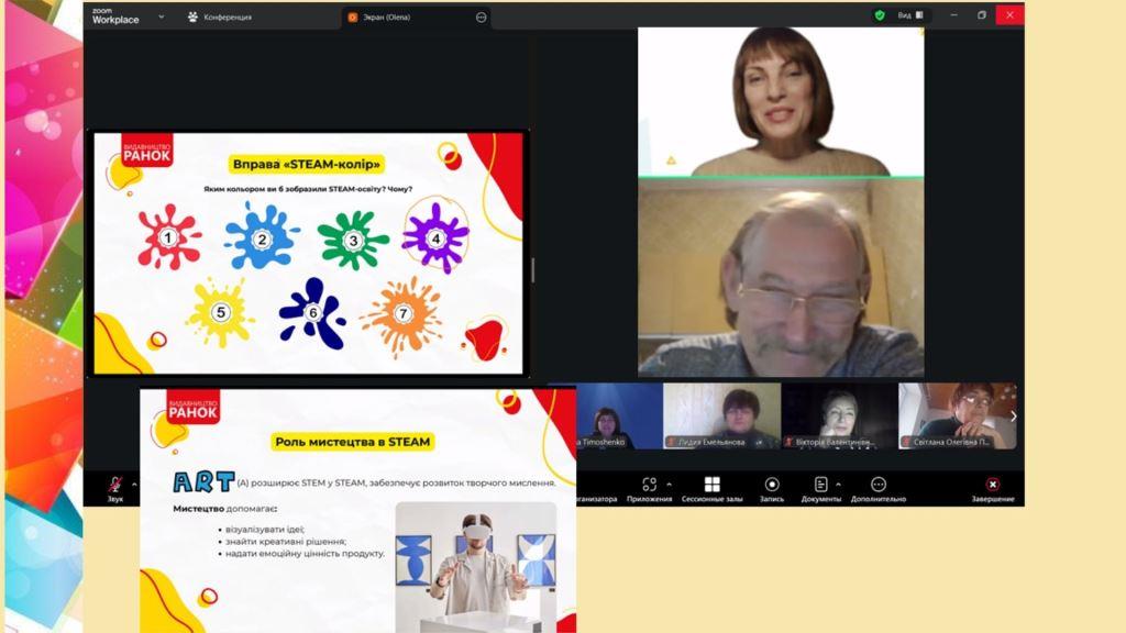 Захід проходив у форматі відеоконференції на платформі Zoom. Спікерка – Олена Штик, методистка з образотворчого мистецтва видавництва «Ранок», розкрила тему STEAM-освіти, зосередивши особливу увагу на критичній ролі мистецтва (Art) як невід’ємної складової цієї міждисциплінарної концепції. Детально пояснила, як алгоритми та технології STEAM інтегруються в освітній процес, забезпечуючи інноваційний підхід до навчання.