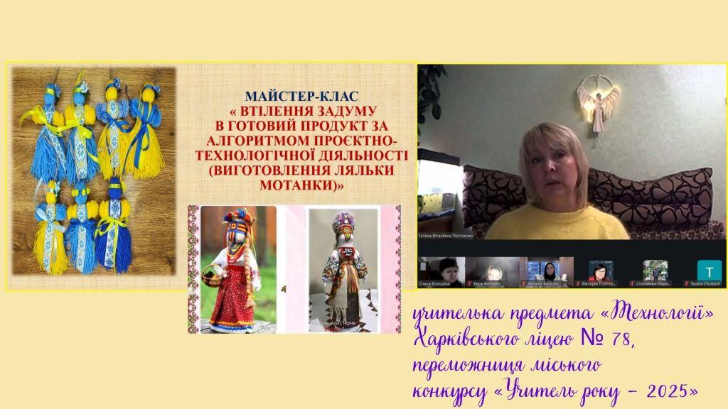 Спікерка зосередила увагу на детальному розборі міфів та оберегового значення ляльки-мотанки, майстерно адаптувавши тексти для дитячого сприйняття та інтегрувавши традиції та сучасність. Вона ознайомила учасників з ключовими етапами проєктування та вимогами до виготовлення виробу, ефективно пов’язавши ці традиційні знання із сучасними методиками викладання.