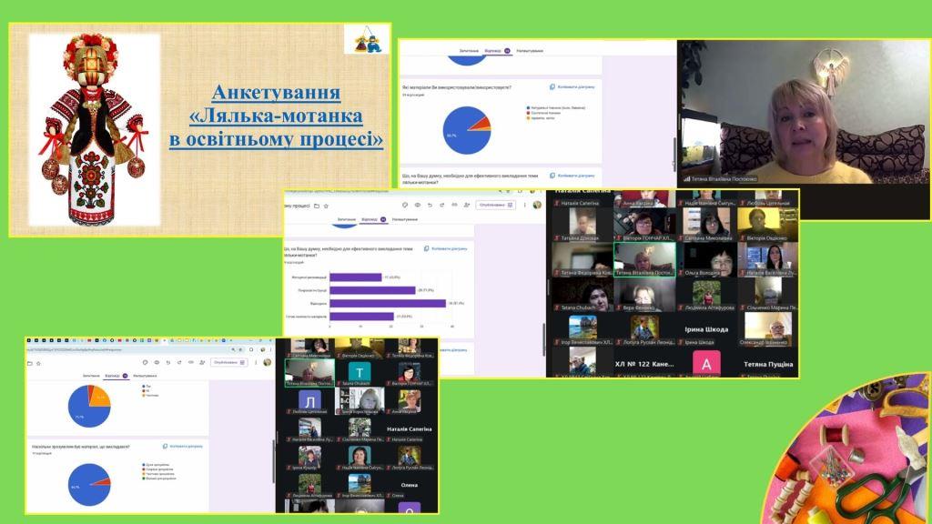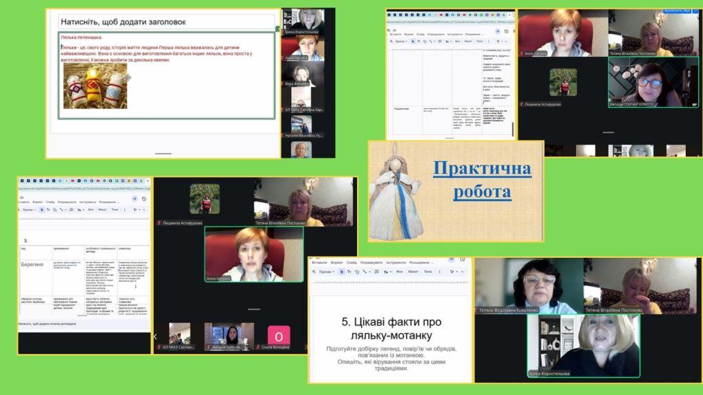Педагоги активно долучилися до практичної частини вебінару. Вони виконали творче завдання, присвячене історії ляльки-мотанки, а також спланували етапи роботи з її виготовлення в межах проєктної діяльності. Для забезпечення ефективної спільної роботи та візуалізації ідей було використано інноваційний онлайн-сервіс Linoit.