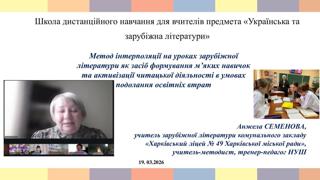 19 березня 2026 року відбулося чергове засідання Школи дистанційного навчання для вчителів «Зарубіжної та української літератур», організоване Харківським центром професійного розвитку педагогічних працівників. Захід у форматі Zoom об’єднав 87 педагогів.