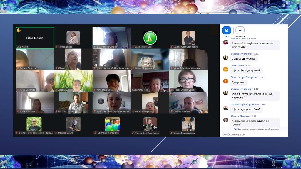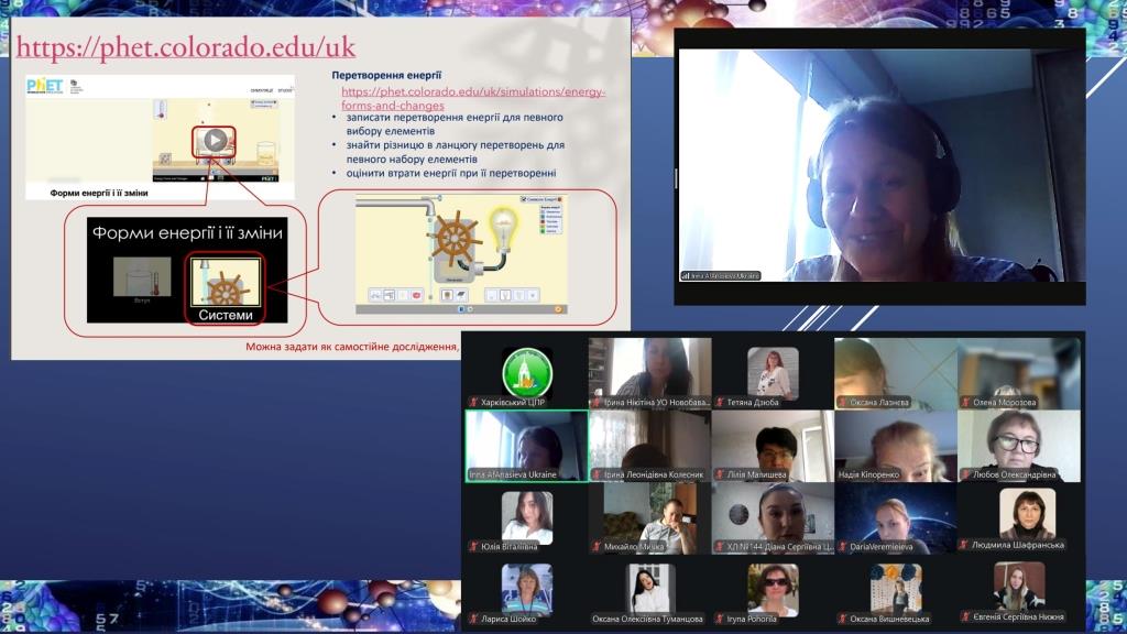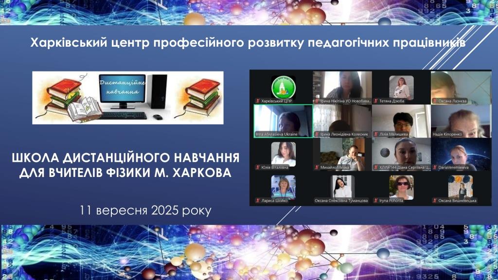11 вересня 2025 року в режимі відеоконференції відбулося заняття «Школи дистанційного навчання для вчителів фізики» за темою «Цифрові помічники вчителя фізики: застосунки для симуляцій фізичних процесів та проведення віртуальних лабораторних робіт». Учасниками зустрічі стали 69 вчителі фізики закладів загальної середньої освіти м. Харкова.