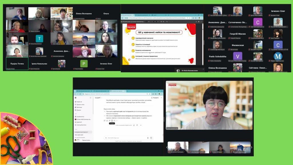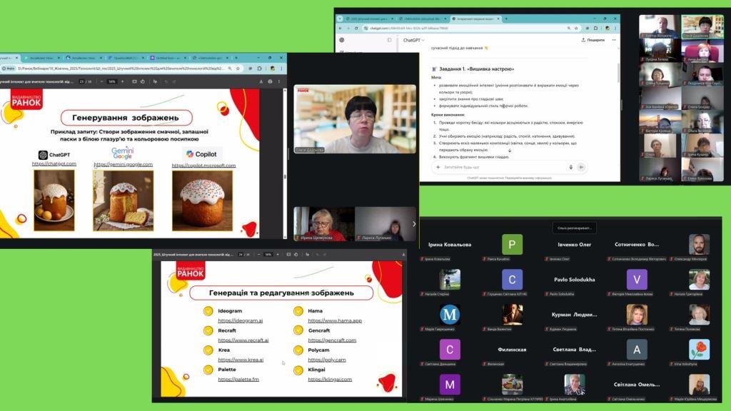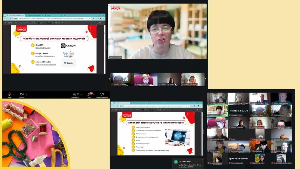 Спікерка вебінару, Олеся Дадонова, методистка з інформатики та технологій видавництва «Ранок», здійснила ґрунтовний огляд типології систем штучного інтелекту в освіті. Розкрила потенціал використання ШІ в навчанні, продемонструвавши низку практичних кейсів і можливостей. Учасників засідання було познайомлено з роботою чат-ботів на основі великих мовних моделей, а також запропоновано інструменти для генерації креативних ігор та вправ.