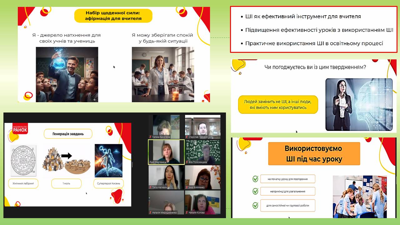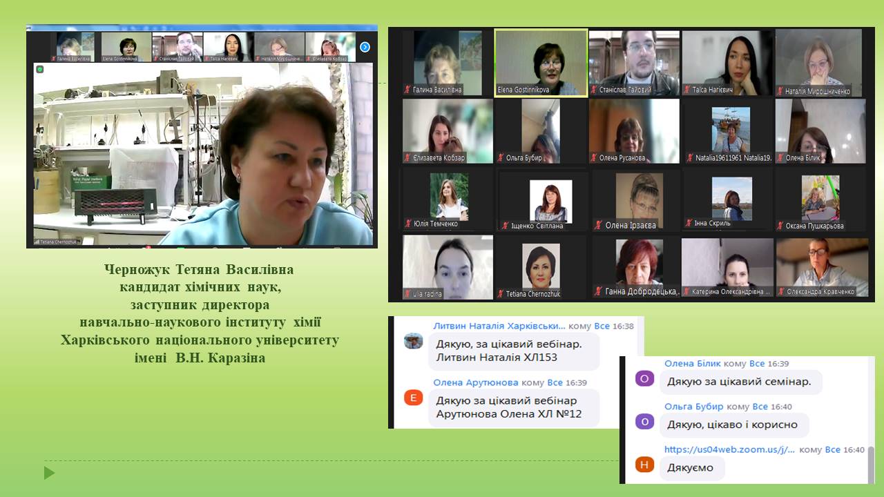 15 жовтня 2025 року в режимі відеоконференції відбулося чергове заняття Школи дистанційного навчання для вчителів хімії за темою «Технології штучного інтелекту – як один з інструментів ефективної роботи вчителя хімії». Учасниками заходу стали 49 учителів хімії закладів загальної середньої освіти міста Харкова, які прагнуть опанувати новітні освітні інструменти.