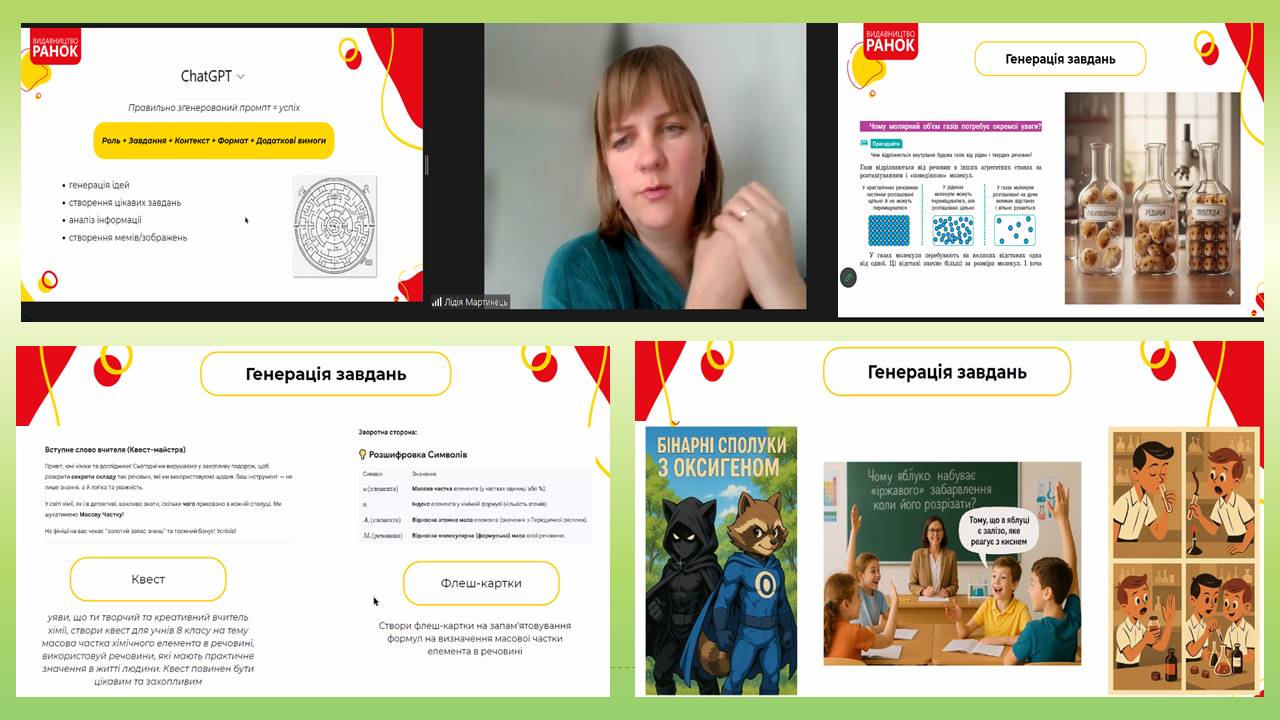 Спікеркою вебінару виступила досвідчена методистка з хімії та біології видавництва «Ранок» Лідія Мартинець. Вона детально ознайомила учасників з можливостями штучного інтелекту та особливостями його ефективного використання в сучасному освітньому процесі, запропонувала конкретні практичні прийоми інтеграції штучного інтелекту безпосередньо в процес навчання хімії. Учасники розглянули інтерактивні інструменти електронного додатка iZZi для проведення цікавих та ефективних уроків хімії.