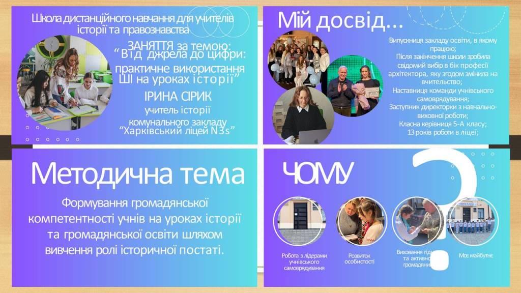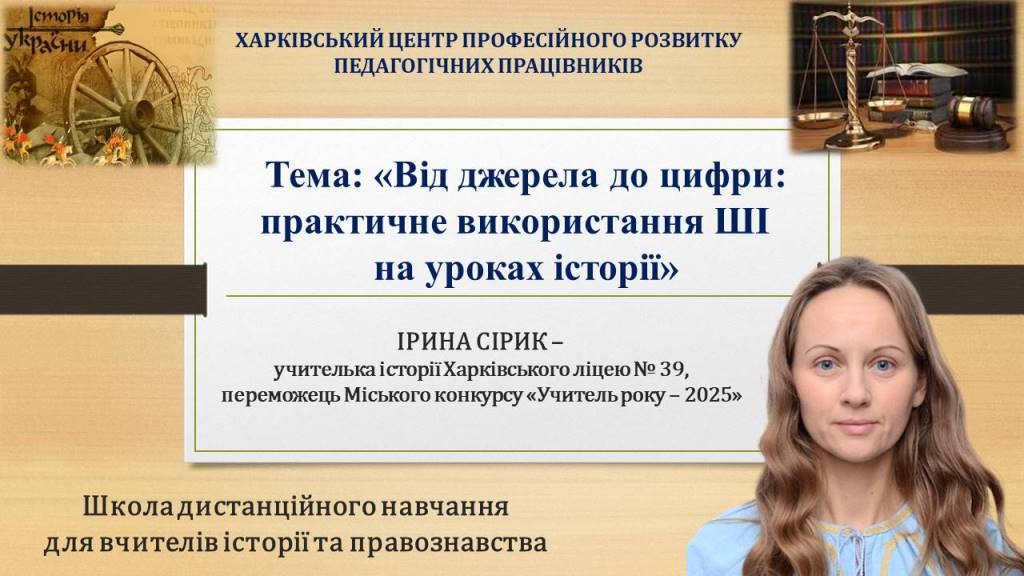 Спікерка ‒ Ірина Сірик, учителька історії Харківського ліцею №39, переможниця Міського конкурсу «Учитель року – 2025», презентувала сучасні можливості цифрових інструментів і штучного інтелекту у викладанні історії.