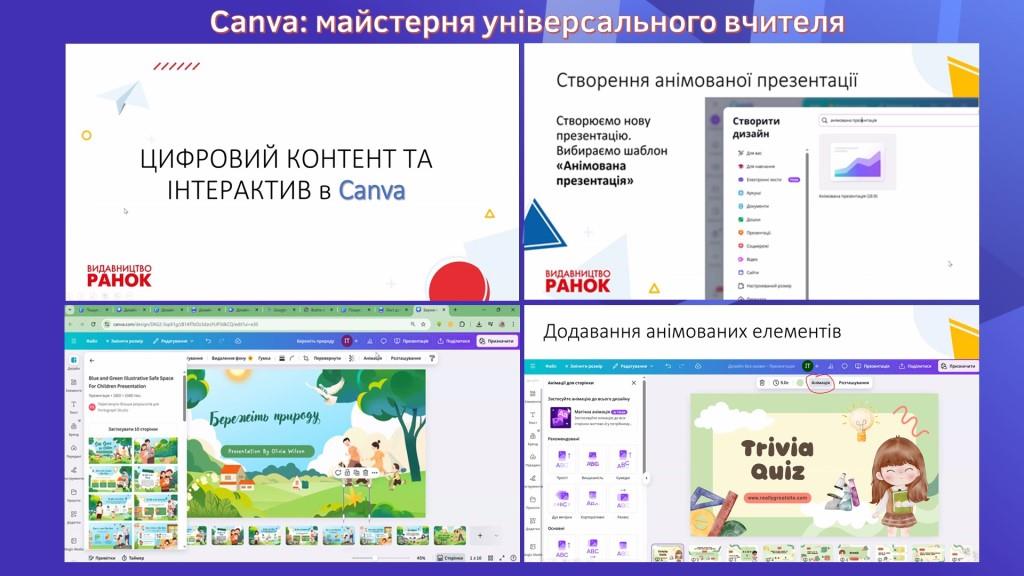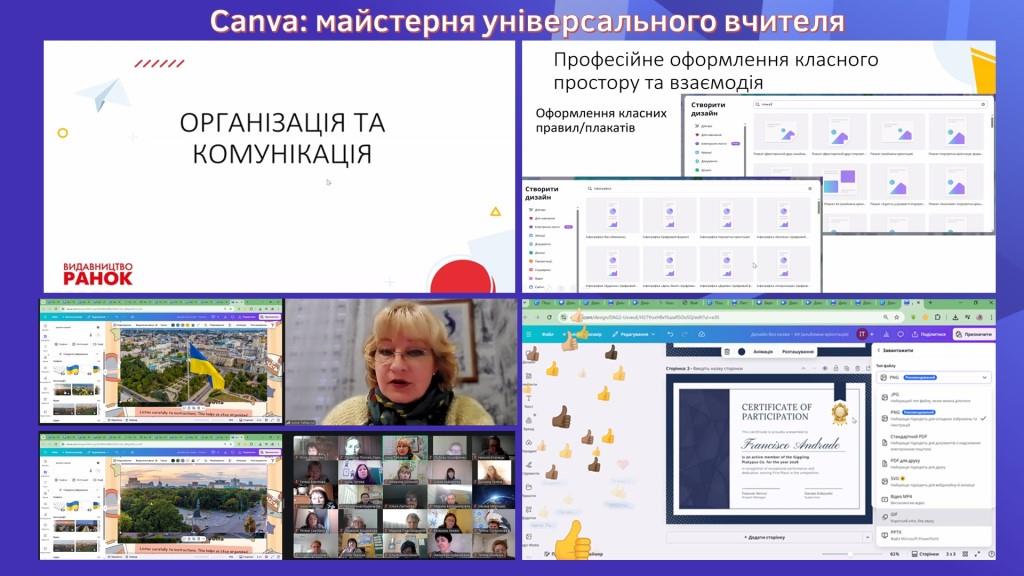 Під час майстерки учасники ознайомилися з можливостями платформи Canva: дізналися, як створювати робочі аркуші, презентації, плакати, сертифікати та візуальні матеріали для уроків; як користуватися шаблонами для економії часу та підвищення якості навчального контенту; як додавати анімацію, відео та інтерактивні елементи до навчальних матеріалів. Спікерка продемонструвала ефективні прийоми роботи з платформою, поділилася практичними порадами та власними напрацюваннями.