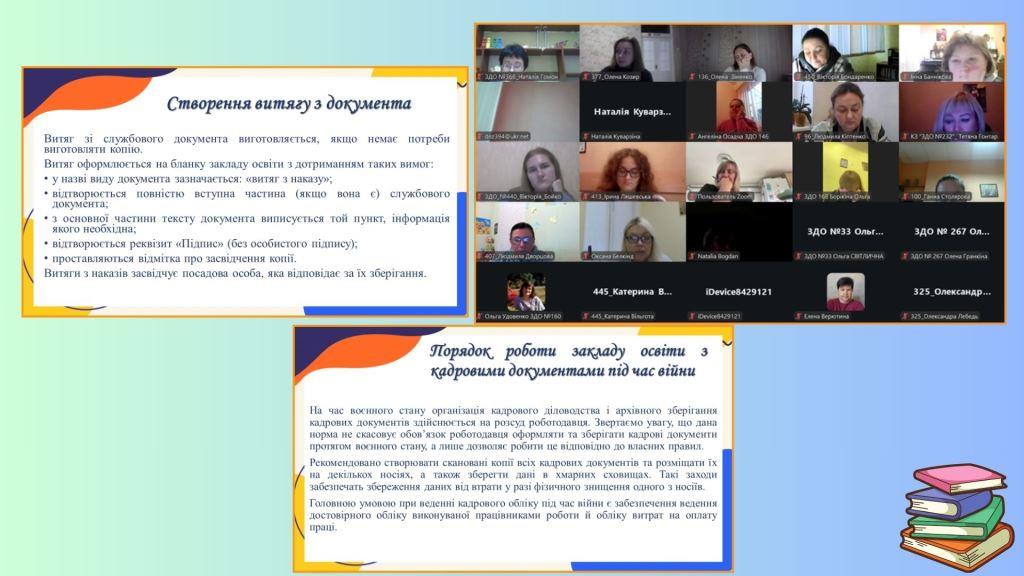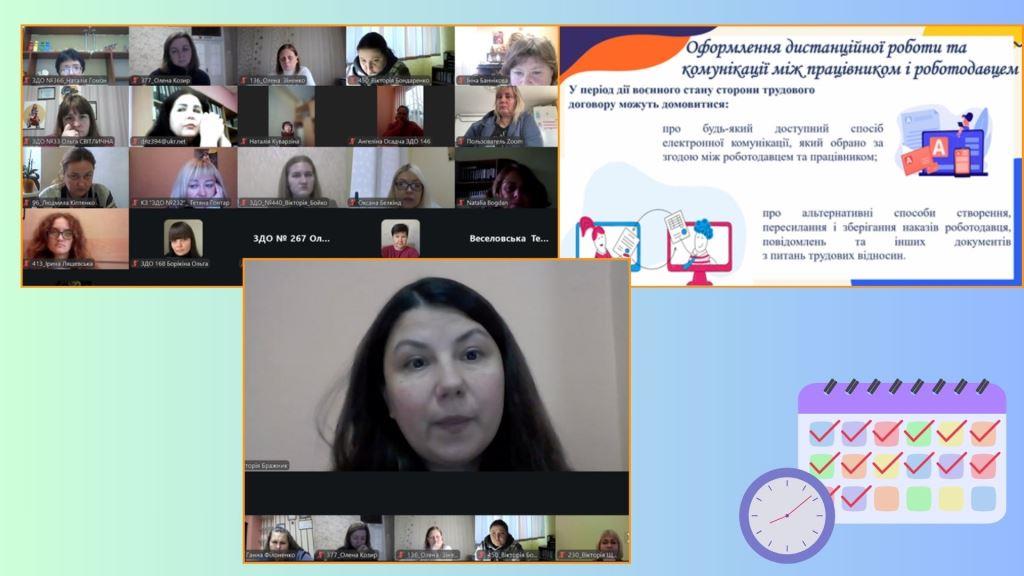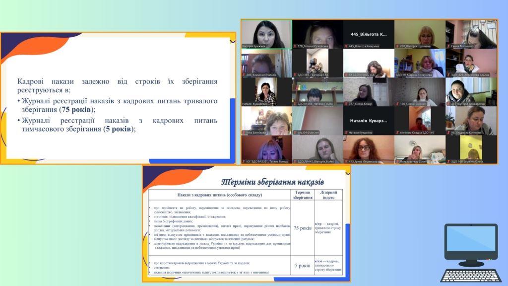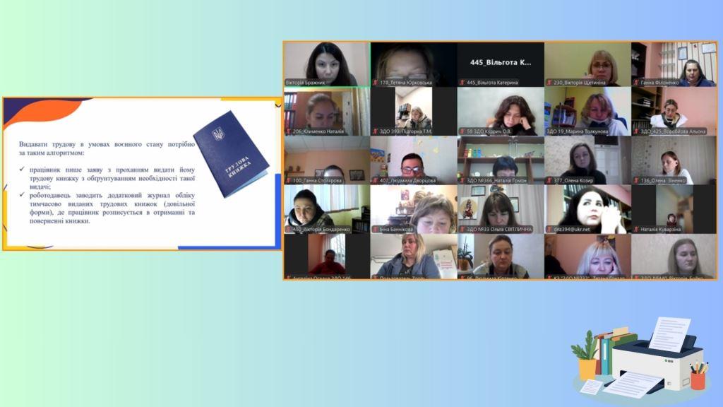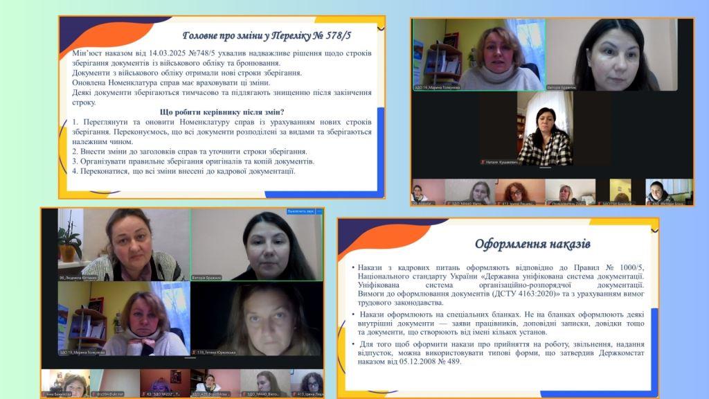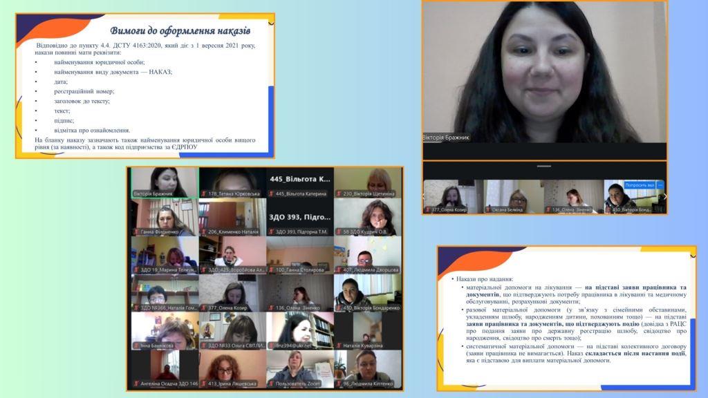 Спікер вебінару – Бражник Вікторія Вікторівна, начальник відділу кадрової роботи Департаменту освіти, ознайомила молодих керівників зі зразками наказів із кадрових питань, організацією контролю за їхнім виконанням, систематизацією та зберіганням документів, а також правилами складання наказів про прийняття на роботу, переведення на іншу посаду, звільнення, надання відпусток, довантаження тощо.
