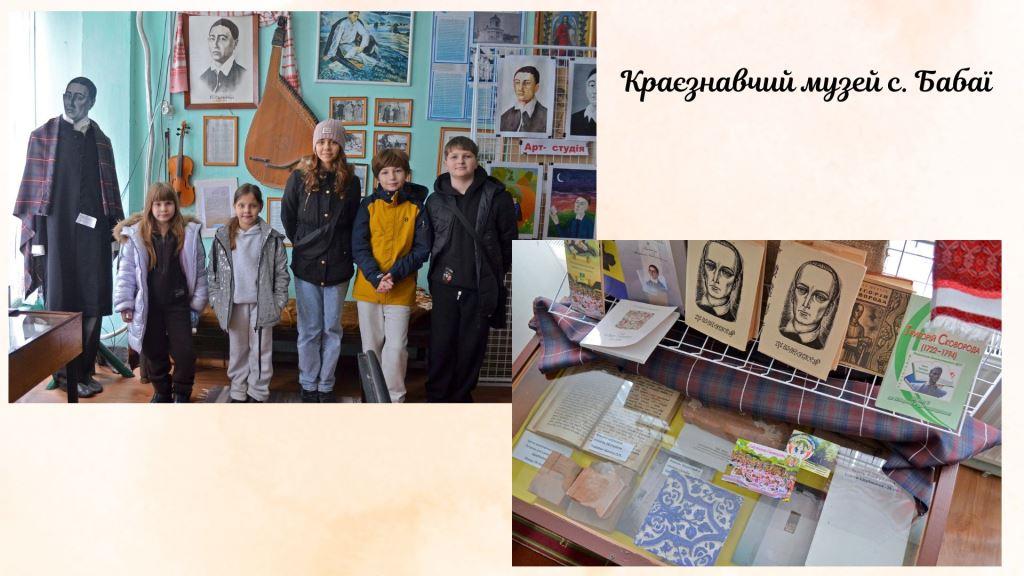 У день народження філософа учні гімназії № 92 відвідали виставку «Сковорода в малюнках», відкриту в краєзнавчому музеї села Бабаї. Школярі з цікавістю переглянули художні інтерпретації образу Сковороди, виконані місцевими митцями та юними художниками. Також діти мали можливість ознайомитися з експозицією предметів побуту минулого століття, що допомогло їм краще зрозуміти епоху, в якій жив і творив великий український філософ.