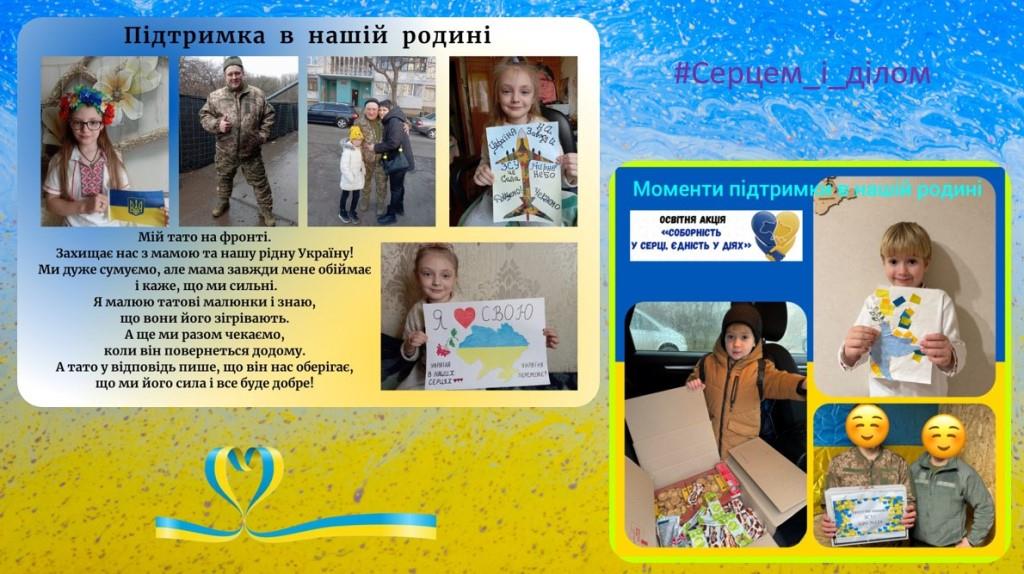 Січнева акція «Соборність у серці, єдність у діях» об’єднала педагогів, учнів, дошкільнят та їхні сім’ї навколо ідей взаємодопомоги та командної праці. У межах ініціативи учасники презентували фотоісторії та відеороздуми про цінності родини, учнівської та педагогічної спільноти й ділилися історіями результативної взаємодії.