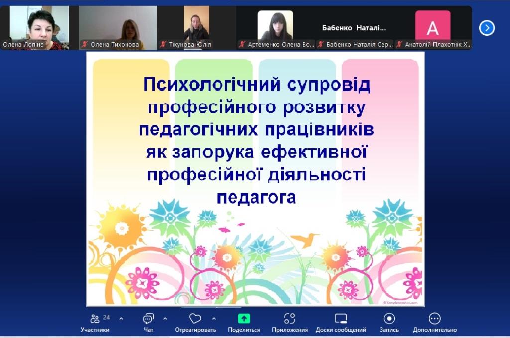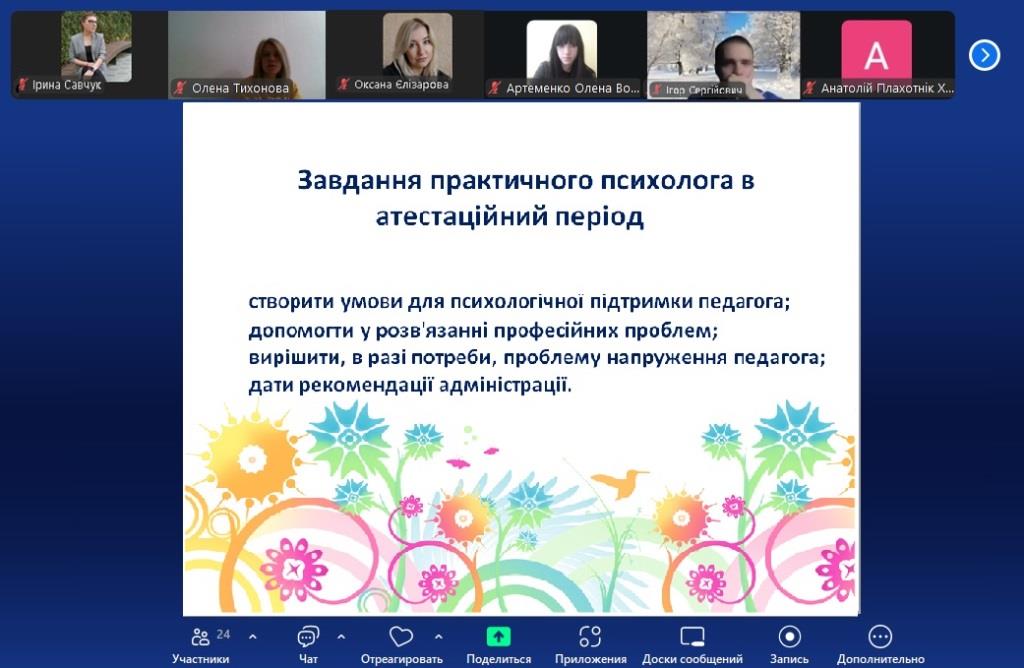 Під час заняття координатори психологічної служби висвітлили питання організації психологічного супроводу педагогічних працівників, зокрема в атестаційний період, особливості партнерської взаємодії з педагогами та форми їхньої професійної підтримки. Учасники пройшли діагностичне опитування щодо здатності до саморозвитку та визначили чинники, що стимулюють або перешкоджають їхньому професійному зростанню.