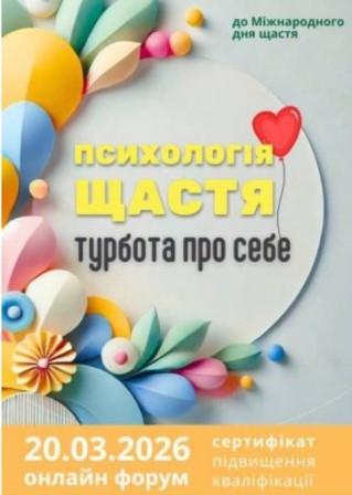 Державна наукова установа «Інститут модернізації змісту освіти» повідомляє, що 20 березня 2026 року відбудеться Всеукраїнський онлайн-форум «Психологія щастя: турбота про себе» (далі Форум).