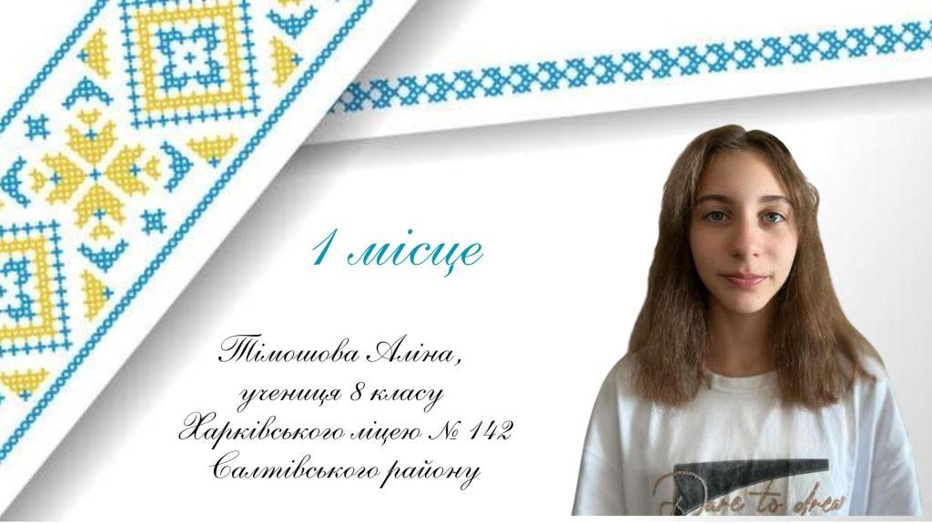 Тімошова Аліна, учениця 8 класу ХЛ № 142 Салтівського району;