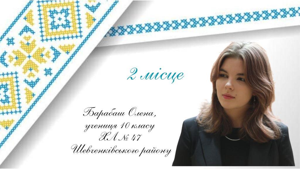 Барабаш Олена, учениця 10 класу ХЛ № 47 Шевченківського району.