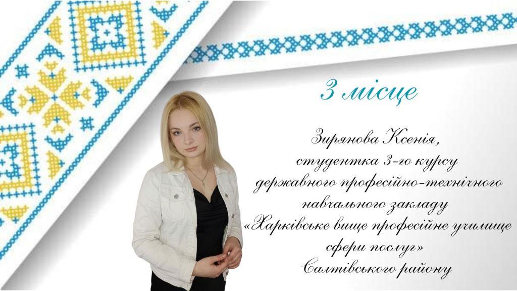 Зирянова Ксенія, студентка ІІІ курсу Харківського вищого професійного училища сфери послуг Салтівського району.