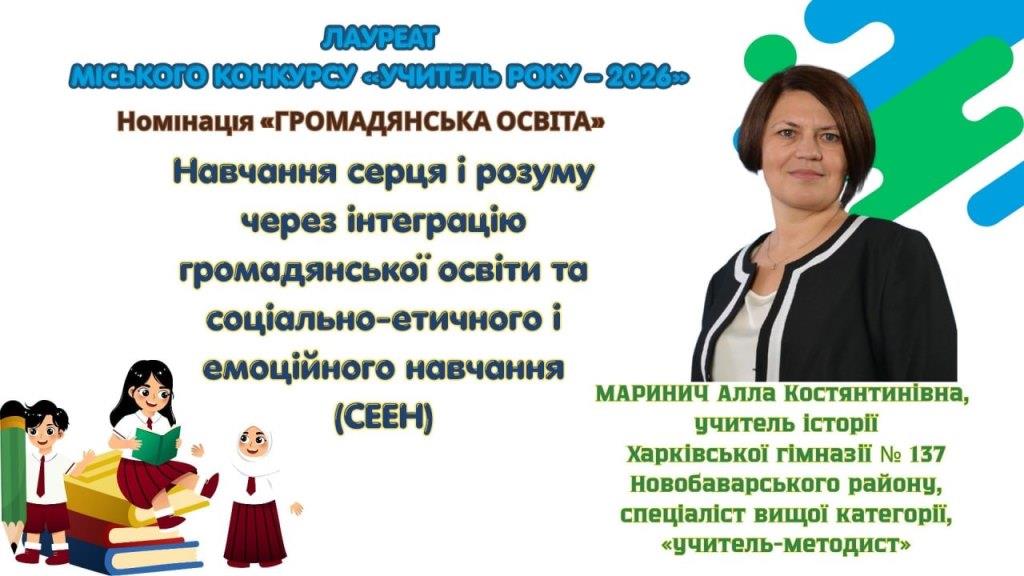 Спікером була Алла Маринич, учитель громадянської освіти Харківської гімназії №137, лауреат міського конкурсу «Учитель року – 2026», презентувала практичні інструменти інтеграції громадянської освіти та соціально-етичного й емоційного навчання в освітній процес.