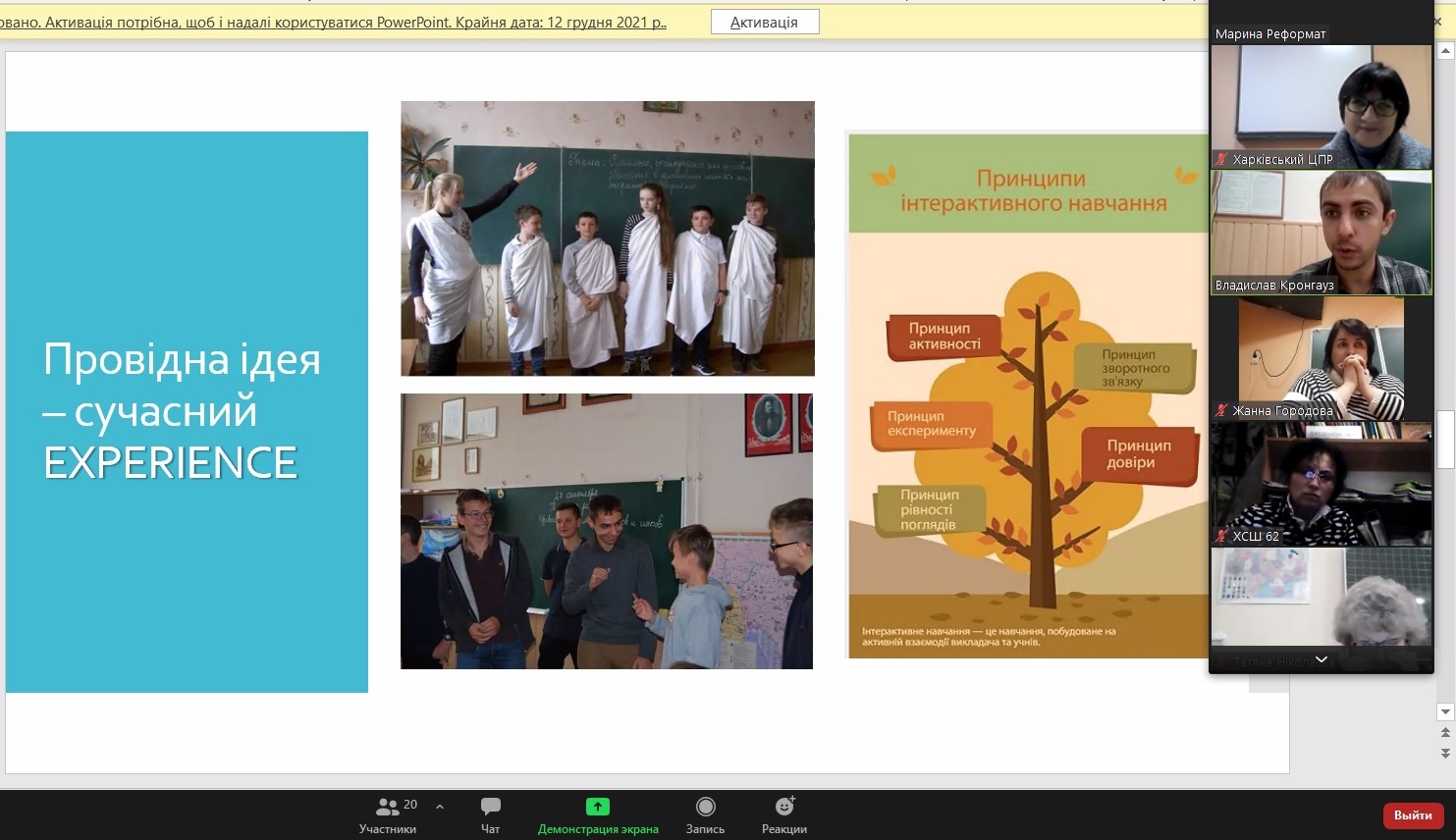 09 грудня 2021 року на базі Харківського центру професійного розвитку педагогічних працівників проведено семінар для вчителів історії «Використання інноваційних методик і технологій на уроках історії».
