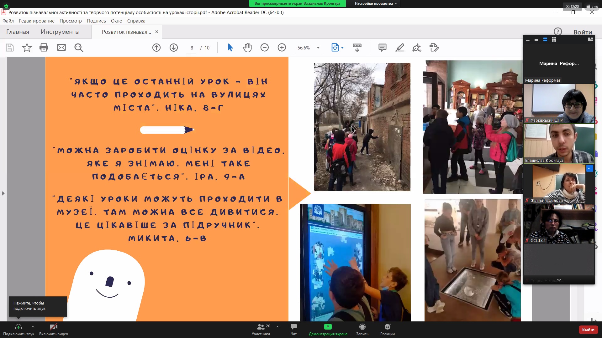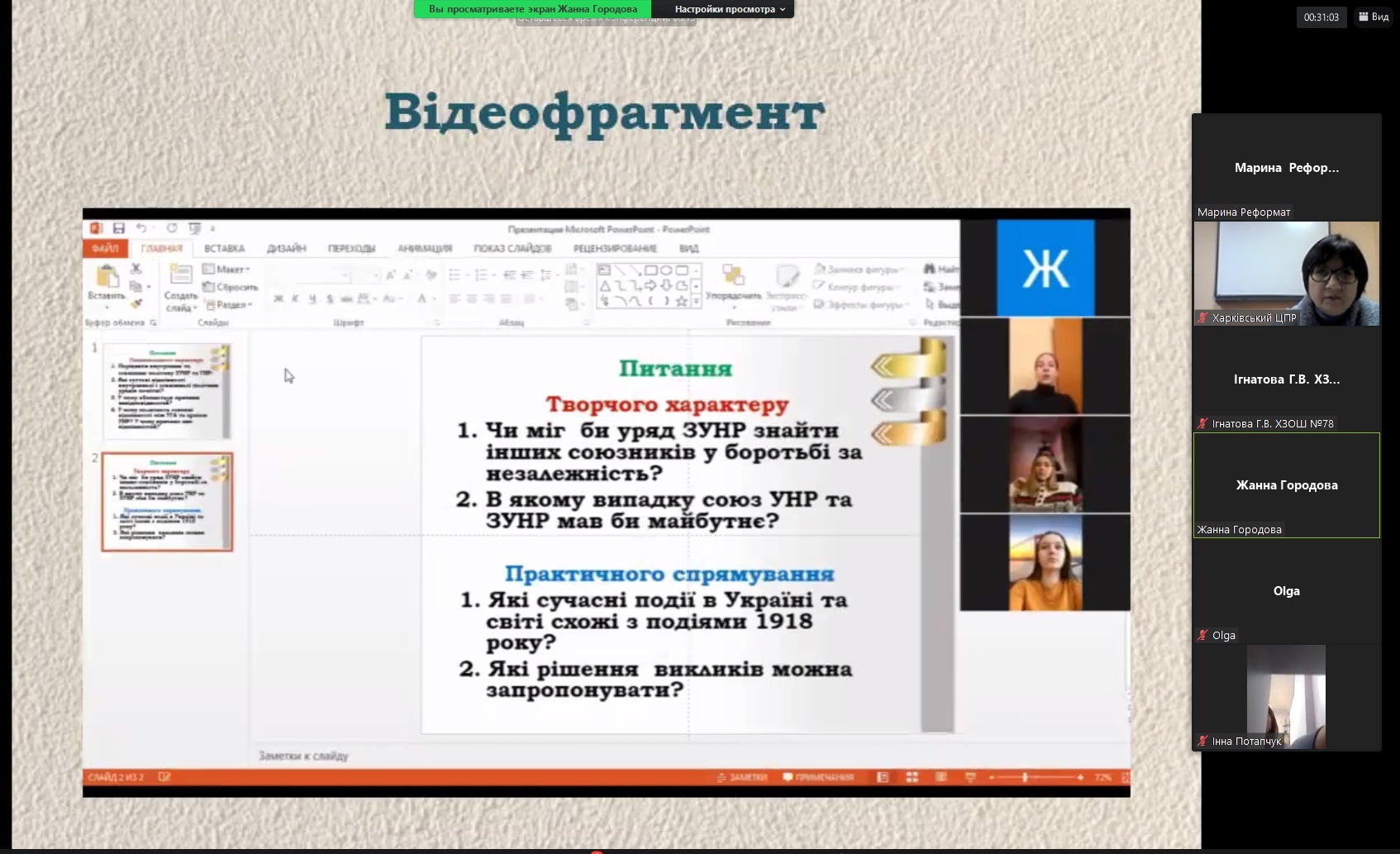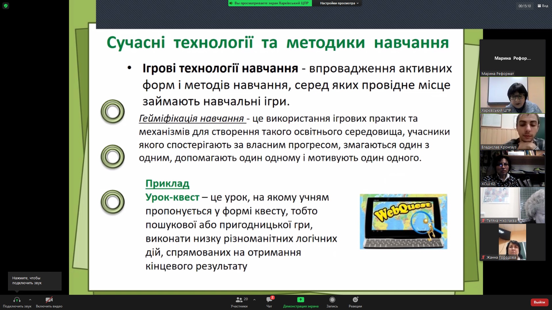 Актуальну тему «Організація пізнавальної діяльності учнів у дистанційному режимі за принципом перевернутого навчання» представила вчитель Харківської гімназії № 46 імені М.В. Ломоносова Ж.В. Городова. Зацікавленість учасників семінару викликав виступ учителя Харківської спеціалізованої школи ІІ-ІІІ ступенів № 3 В.О. Кронгауза «Елементи історичної реконструкції засобами інсценування та гаджет-застосунки на уроках історії як сучасний experience».